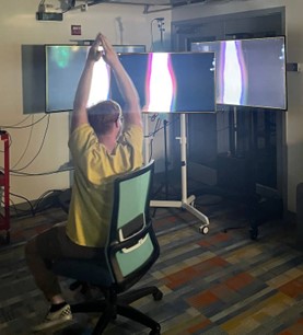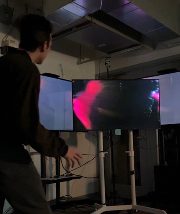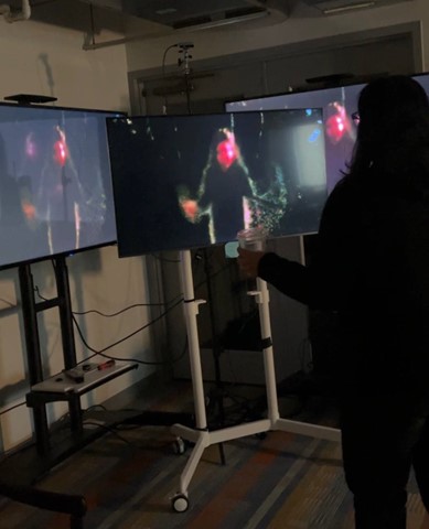 This project utilized the RealSense and Touch Designer to gather depth data and then use that data to create a simulation within the screen. The actual installation was fairly simple. 3 TVs in a corner and a mounted RealSense behind all of the TVs to get a good angle. We were originally going to use a projector since that seemed more fun but because we couldn't find a good work around for the person's shadows disrupting the projection, we pivoted to TVs.
